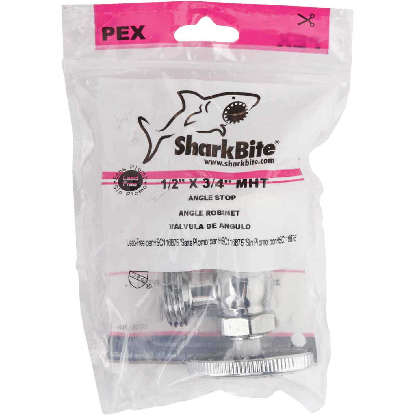 SharkBite 1/2″ x 3/4″ brass barb chrome MHT angle stop 1 per bag. The SharkBite barb connection system is the best option for connecting PEX tubing in water distribution systems when lower material cost is desired. Robustly constructed with DZR brass and are corrosion resistant. NSF approval.