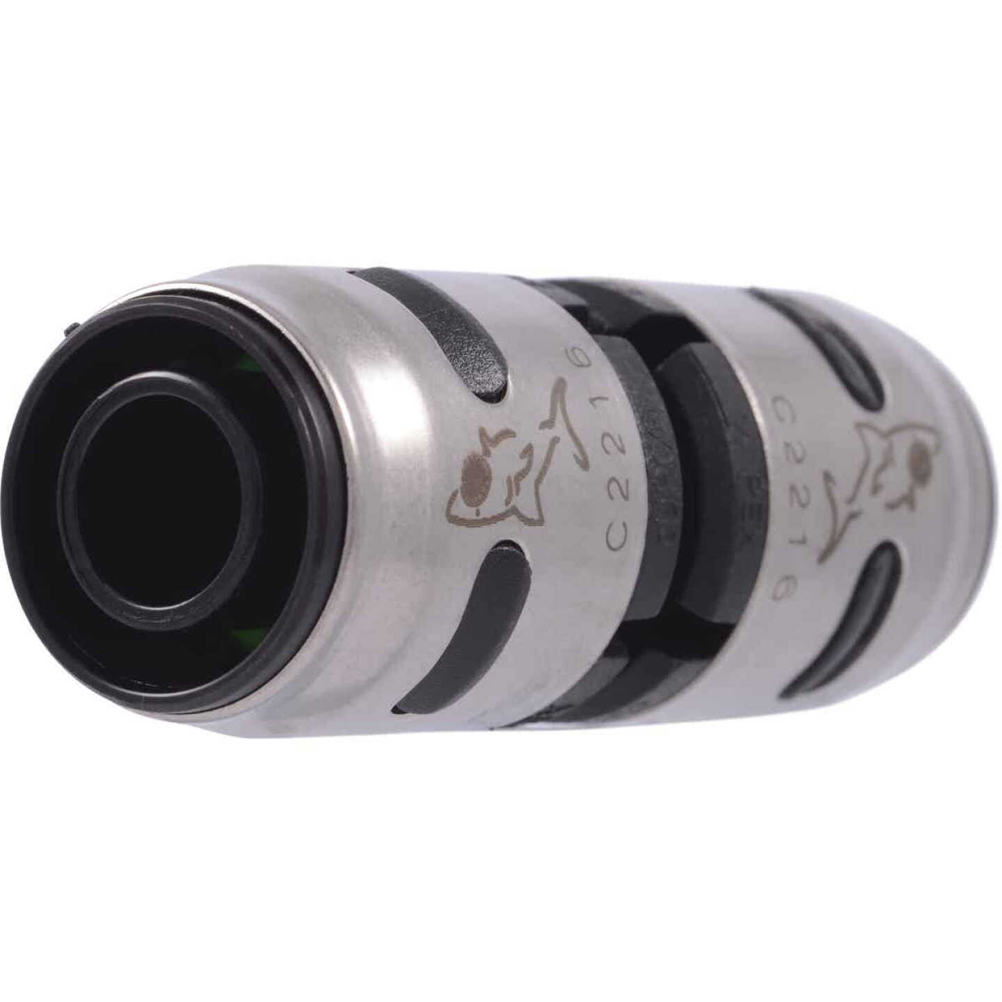 This push-to-connect fitting is designed to make PEX-to-PEX connections in potable water and radiant heating (including underground or behind-the-wall) applications with no access panels required. No soldering, clamps, unions or glue required. Insert PEX pipe into the fitting deep enough to be sealed by o-ring. Once inserted, stainless steel teeth bite down and grip the pipe. Green indicator ring will display in the slots around the fitting to visually display that permanent inner-diameter connection is secure. Made of engineered polymer. Fittings are rated up to 80 psi @ 200 F, 100 psi @ 180 F, and 160 psi @ 73.4 F.